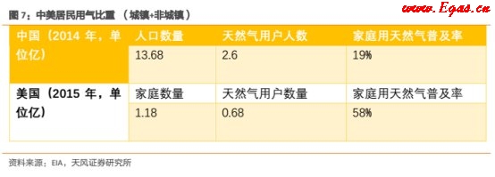居民天然氣消費(fèi)擁有很大的潛力,因?yàn)槟壳爸挥行〔糠殖鞘芯用窨墒褂锰烊粴狻8鶕?jù)國家統(tǒng)計(jì)局?jǐn)?shù)據(jù),中國不到20%的人口可使用管道天然氣,而美國的這一數(shù)字達(dá)58%。隨著可支配收入和生活水平的提高,越來越多的居民出于便利性和清潔性而傾向于使用管道天然氣。