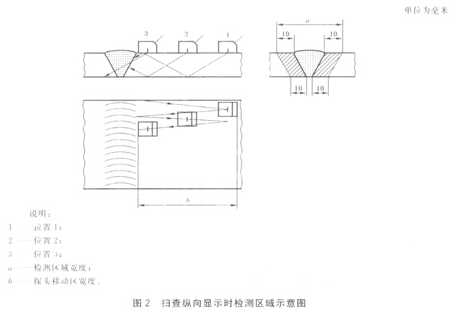 檢測(cè)區(qū)域(見圖2)是指焊縫和焊縫兩側(cè)至少10mm寬母材或熱影響區(qū)寬度(取二者較大值)的內(nèi)部區(qū)域。