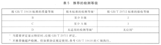 當(dāng)規(guī)定使用ISO 17635時(shí),表5給出了推薦的檢測(cè)等級(jí)和驗(yàn)收等級(jí)。