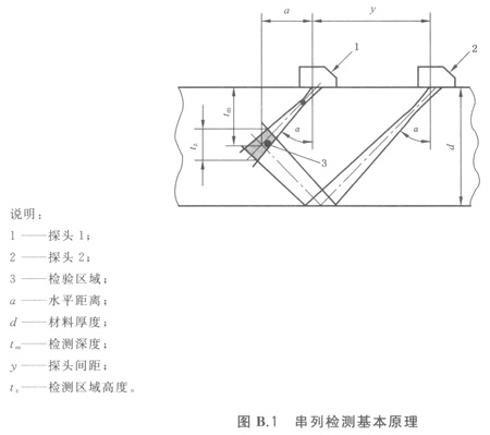斜探頭間距(y)、聲束軸線交叉點(diǎn)檢測深度(tm)和檢測區(qū)域高度(tz)之間的關(guān)系見圖B.1。