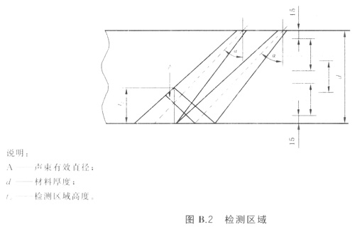 檢測區(qū)域高度(tz)可用參考試塊上不同深度反射體來測定,或用接近對面最大聲程結(jié)合聲束有效直徑來計算: