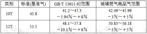 以常見的天然氣10T和12T為例(相當于國際聯(lián)盟標準的L類和H類),其成分主要由甲烷和少量惰性氣體組成,燃燒特性比較類似,一般可用單一參數(shù)(華白數(shù))判定其互換性。表1中所列華白數(shù)的范圍是指GB/T13611-92規(guī)定的最大允許波動范圍,但作為商品天然氣供給作城鎮(zhèn)燃氣時,應適當留有余地,參考英國規(guī)定,是留有3%~5%的余量,則10T和12T作城鎮(zhèn)燃氣商品氣時華白數(shù)波動范圍如表2,可作為確定商品氣波動范圍的參考。