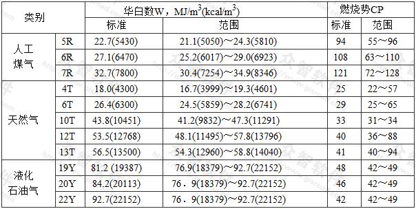 現(xiàn)行的國家標準《城市燃氣分類》GB/T13611,詳見表1(華白數(shù)按燃氣高發(fā)熱量計算)。