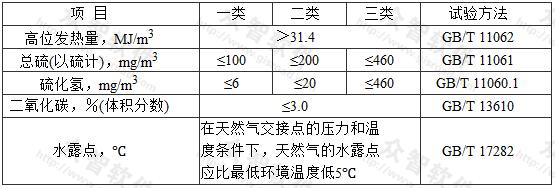 1)天然氣發(fā)熱量、總硫和硫化氫含量、水露點指標應符合現(xiàn)行國家標準《天然氣》GB17820的一類氣或二類氣的規(guī)定;