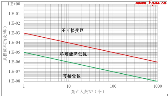 個人可接受風險標準描述的是危化裝置周圍某一固定位置處單個人員對風險的可接受水平,社會可接受風險標準是?;b置周邊一定范圍內(nèi)社會公眾整體對風險的可接受水平。社會可接受風險標準是對個人可接受風險標準的補充,為避免當個人風險滿足標準要求時,由于人口密度過高導致的群死群傷事故概率超過公眾可接受范圍。例如100年發(fā)生1次死亡100人的事故和100年發(fā)生100次1人死亡的事故的個人風險相同,但我們要采取措施進一步避免1次死亡100人的事故發(fā)生,因此對危險源周邊的人口密集區(qū)域需要從社會風險的角度提出補充要求。