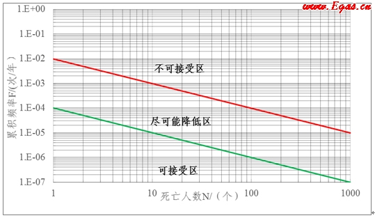 綜合考慮,我國采用香港地區(qū)的社會可接受風險標準值,作為個人可接受風險標準的補充對危險源造成群死群傷事故風險的可接受程度進行評估。