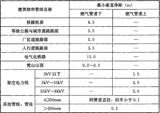 表6.2.3 跨越管橋(架)底與鐵路、道路、其他管線交叉時的垂直凈距