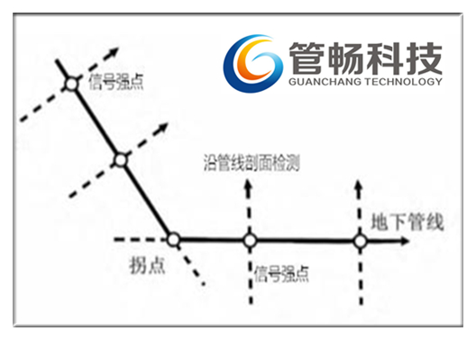 在探測(cè)過程中,如果沿管道走向探測(cè)時(shí),聲音突然減弱,這時(shí)可在此點(diǎn)與上一個(gè)點(diǎn)之間詳細(xì)監(jiān)聽,找出聲音最強(qiáng)點(diǎn)即為彎頭所在位置(一般情況下由于聲波在管道彎頭處與管壁摩擦加劇,因此信號(hào)比直線位置點(diǎn)信號(hào)更強(qiáng))。同時(shí)可以回到上一個(gè)點(diǎn)以此點(diǎn)為圓心,以3米為半徑沿圓周線盲找,在找出信號(hào)最強(qiáng)點(diǎn)后,再以此點(diǎn)為圓心沿圓周,找出另一個(gè)信號(hào)較強(qiáng)的位置點(diǎn),將這兩點(diǎn)連成一條直線。在確定兩條管線走向后,將這兩條管線延伸交匯于一點(diǎn),該點(diǎn)即可判定為管線的拐點(diǎn)。在實(shí)際探測(cè)過程中,可以結(jié)合兩種方法綜合判斷。此外如果在沿圓周盲探時(shí),沒有遇到信號(hào)強(qiáng)點(diǎn),可擴(kuò)大探測(cè)半徑尋找信號(hào),如果確定無法找到信號(hào)源,可判定此處為管道終點(diǎn),此時(shí)可以在上個(gè)點(diǎn)沿走向詳查,找出信號(hào)最大點(diǎn)即為管道終點(diǎn)。