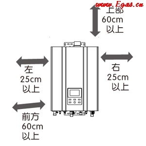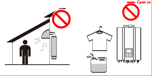 • ② 熱水器切勿安裝在浴室內(nèi)(平衡機除外),在車輛、船只上,切勿將熱水器暗裝。