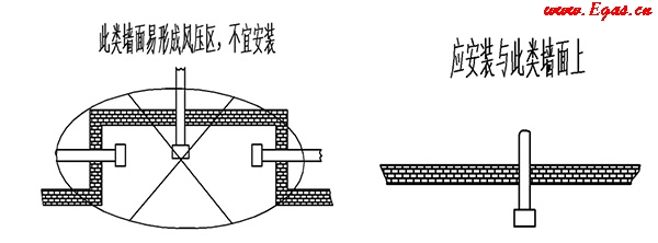 • ③ 排煙口不得安裝在樓房的換氣風道或公共煙道上;排煙孔位置應(yīng)避開墻面易形成正壓區(qū)的凹形區(qū)。