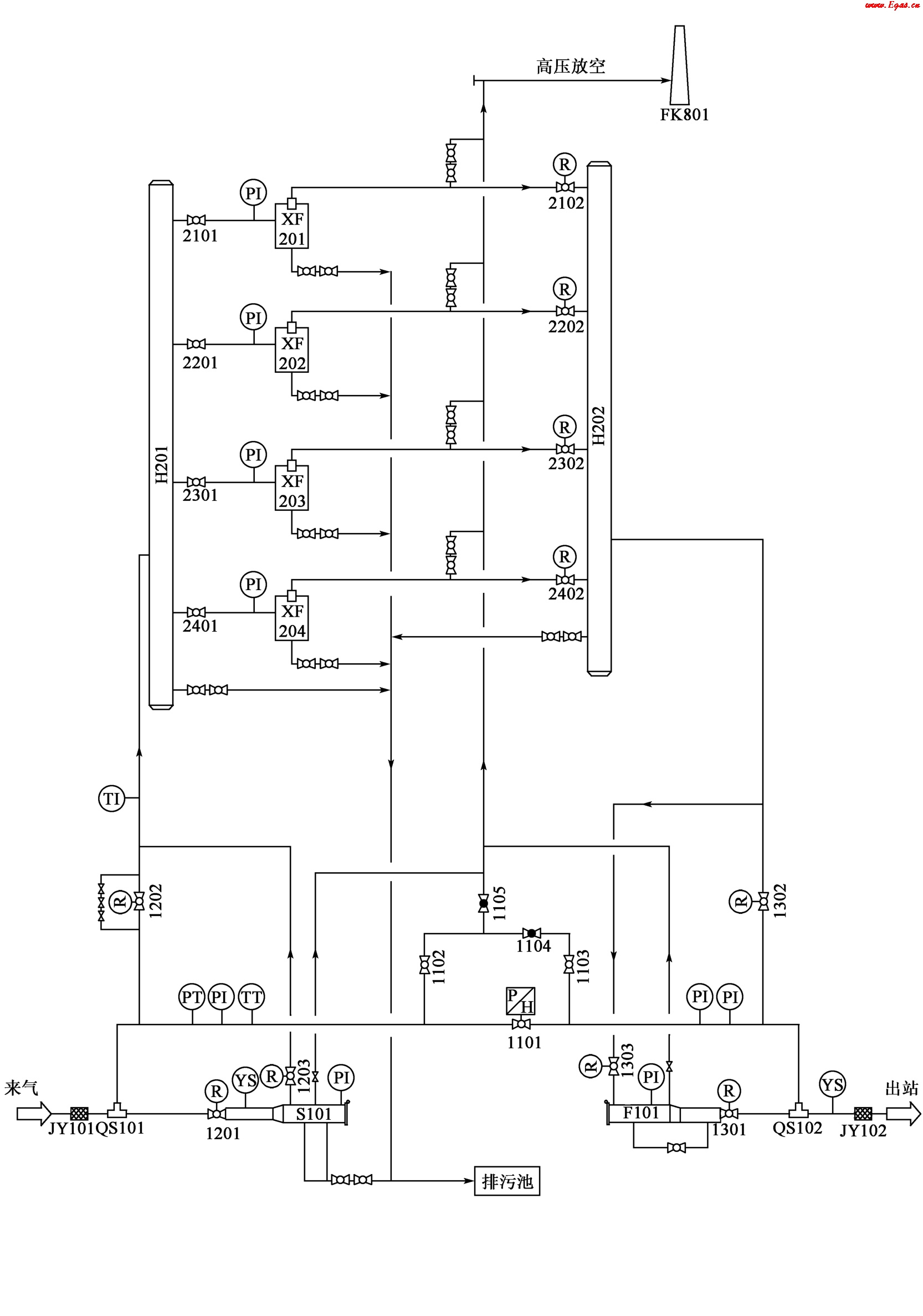 清管站的功能就是收發(fā)清管器。長輸管道的清管作業(yè)有投產(chǎn)前清管和正常運行期間清管。投產(chǎn)前清管的主要目的是清除管道內(nèi)雜質(zhì),主要包括施工期間的泥土、焊渣、水等。正常運行期間的清管是指管道運行一段時間后,由于氣體內(nèi)含有一定的雜質(zhì)積存在管線內(nèi),使管輸效率下降,對管線造成腐蝕等,因此需要對管線進行清管。常見清管站工藝流程圖,如圖3-1所示。