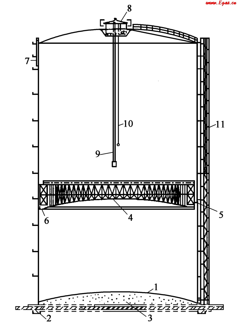 1—底板;2—環(huán)形基礎(chǔ);3—砂基礎(chǔ);4—活塞;5—密封墊圈;6—加重塊;7—燃?xì)夥派⒐埽?—換氣裝置;9—內(nèi)部電梯;10—電梯平衡塊;11—外部電梯
