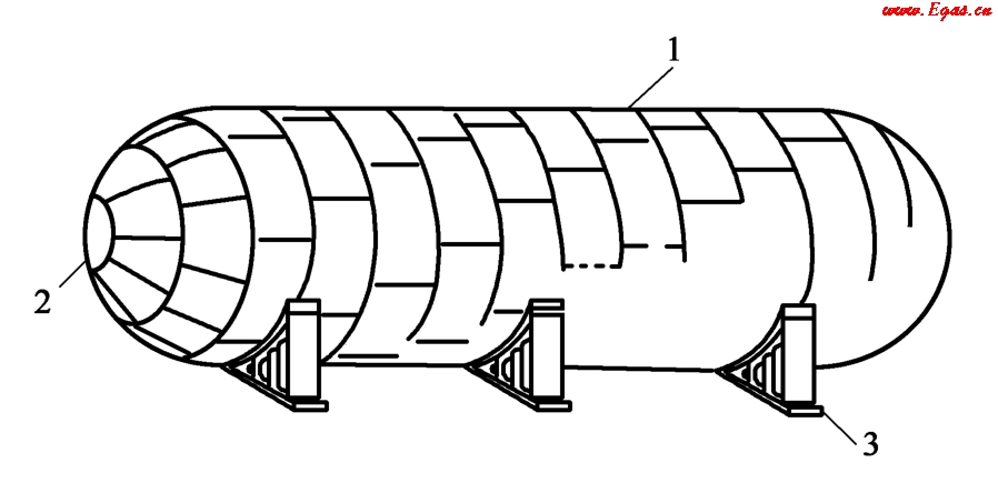 圓筒形罐如圖6-4所示,是由鋼板制成的圓筒體和兩端封頭構(gòu)成的容器。封頭可為半球形或橢圓形。圓筒形罐根據(jù)安裝的方式可以分為立式和臥式兩種,前者占地面積小,但基礎(chǔ)要承受圓筒體在風(fēng)力下形成的風(fēng)彎矩,基礎(chǔ)尺寸較大,后者占地面積大,但基礎(chǔ)較為簡單。臥式儲罐罐體都設(shè)有兩個鋼制鞍式支座,支座中的一個與基礎(chǔ)之間要能滑動,以防止罐體熱脹冷縮時產(chǎn)生溫度應(yīng)力。