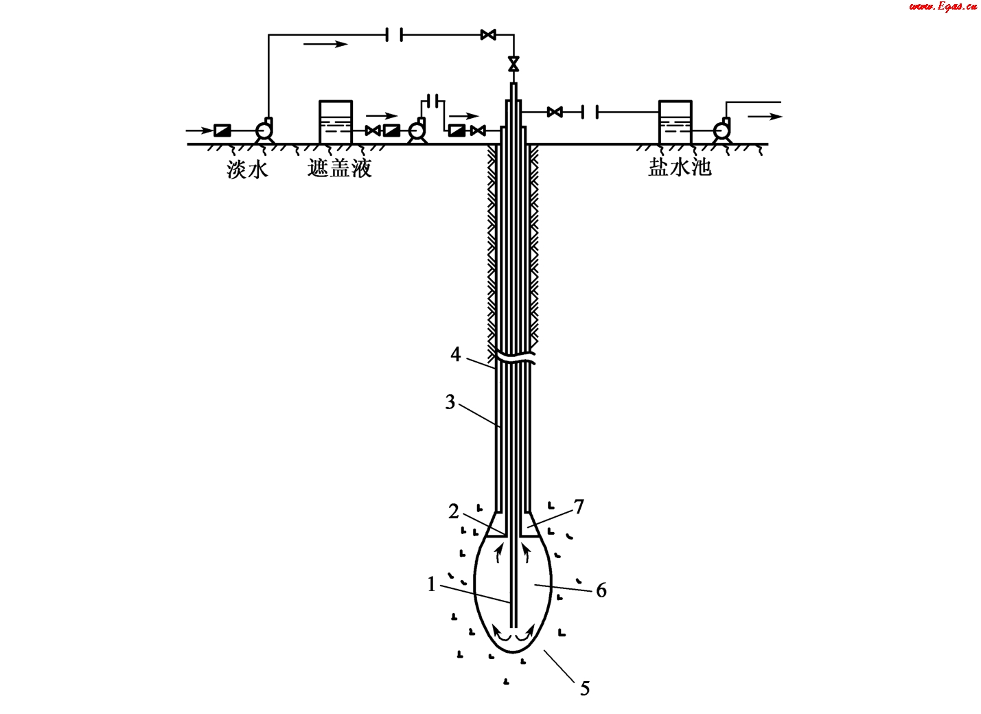 圖6-10是利用鹽礦層建造儲氣庫的排鹽設(shè)備流程。將井鉆到鹽層后,把各種管道安裝至井下。由工作泵將淡水通過內(nèi)管壓到巖鹽層。飽和鹽水從內(nèi)管和溶解套管之間的管腔排出。當(dāng)通過幾個測點(diǎn)測出的鹽水飽和度達(dá)到一定值時,排除鹽水的工作即可停止。為了防止儲庫頂部被鹽水沖溶,要加入一種遮蓋液,它不溶于鹽水,而浮于鹽水表面。不斷地增加遮蓋液量和改變?nèi)芙馓坠荛L度,使儲庫的高度和直徑不斷擴(kuò)大,直到達(dá)到要求為止。儲氣庫建成后,在第一次注氣時,要把內(nèi)管再次插到儲氣庫底部,從頂部打入燃?xì)?,將殘留的鹽水置換出庫。鹽礦層儲氣庫工作流程如圖6-11所示。
