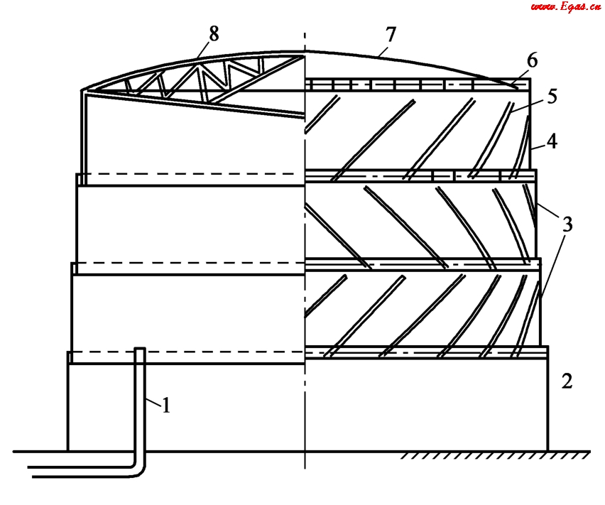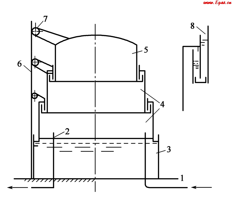 1—進(jìn)氣管;2—出氣管;3—水槽;4—塔節(jié);5—鐘罩;6—導(dǎo)軌立柱;7—導(dǎo)輪;8—水封