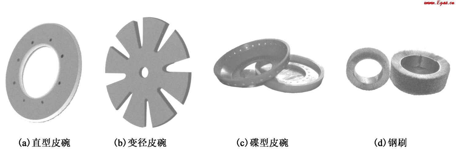 圖12-7為管道清管器用皮碗和鋼刷。直型皮碗主要用于雙向直型清管器中,皮碗的直徑大于管道的內(nèi)徑,靠彈性力保持清管器前后的密封,這種密封條件會(huì)很快地隨磨損而喪失,所以直型皮碗的使用壽命比碟型皮碗短。變徑皮碗實(shí)為直型皮碗的一種形式,主要用于變徑管道的清掃。碟型皮碗具有更好的密封性能,有深碟和淺碟之分,同時(shí)還可在皮碗上加鋼釘增加清掃效果。鋼刷應(yīng)可與皮碗進(jìn)行良好的互換,在管道清掃過程中,對管道的除銹、除垢具有良好的清掃效果。