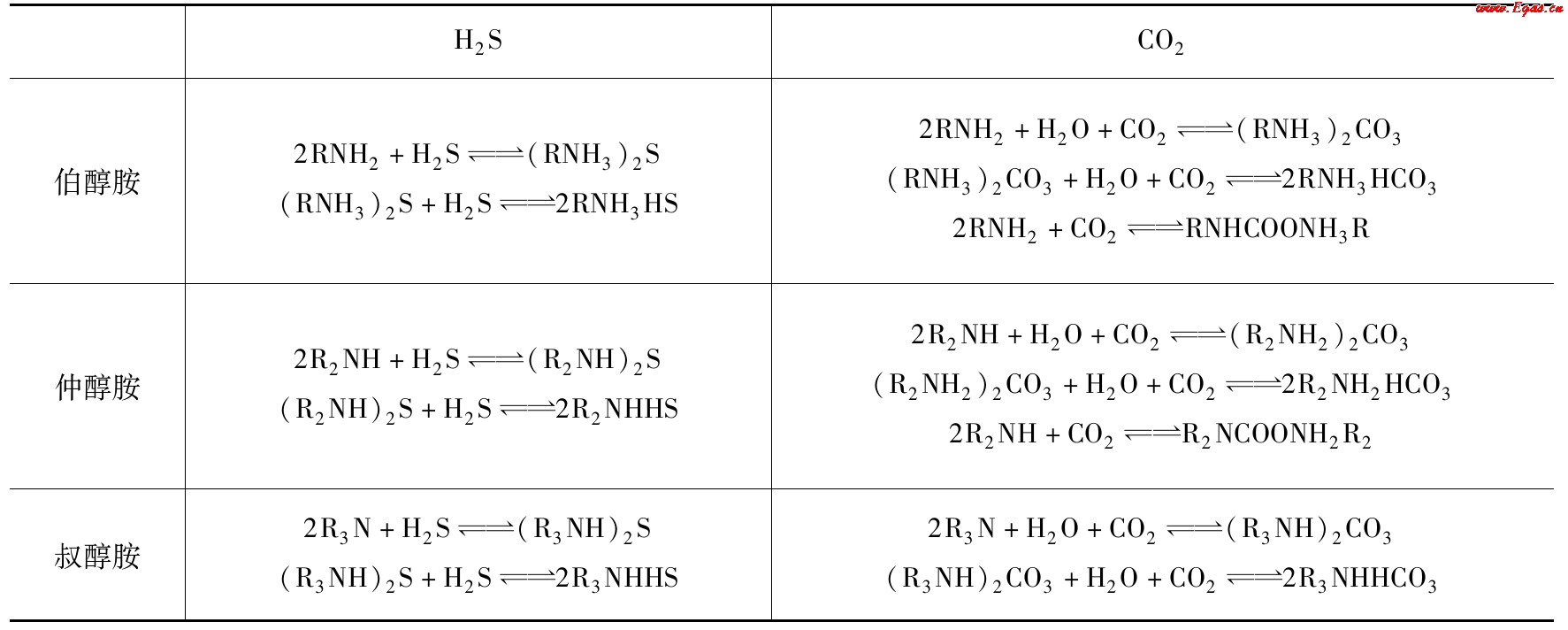 表2-3 醇胺吸收H2S和CO2的主要反應