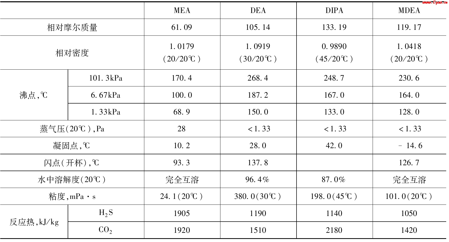 在化學溶劑法中,各種胺法應用廣泛。所使用的胺有一乙醇胺(MEA)、二乙醇胺(DEA)、二異丙醇胺(DIPA)、甲基二乙醇胺(MDEA)、二甘醇胺(DGA)。醇胺脫出酸性氣體流程見圖2-1。幾種醇胺溶劑的物化性質見表2-4。MEA是伯醇胺,在幾種醇胺溶劑中堿性最強,與酸性組分迅速反應,很容易使原料氣中的H2S降到5mg/m3以下,最低可到1.5mg/m3;在脫除H2S的同時,CO2脫除率超過90%,在兩種酸性組分之間沒有選擇性。MEA化學性能穩(wěn)定,可以最大限度地降低溶劑降解損失;缺點是蒸氣壓高,溶劑損失量大,腐蝕性強。DEA是仲醇胺,堿性較MEA弱,同樣對H2S和CO2沒有選擇性。其凈化度沒有MEA高,即使采用SNPA(法國阿基坦國家石油公司)改進型工藝,也只能達到2.29mg/m3。DEA優(yōu)點是溶劑蒸發(fā)損失較MEA小,腐蝕性弱,再生時具有較MEA溶劑低的殘余酸性組分濃度。DIPA和MDEA兩種溶劑均是近年來采用的選擇性溶劑。