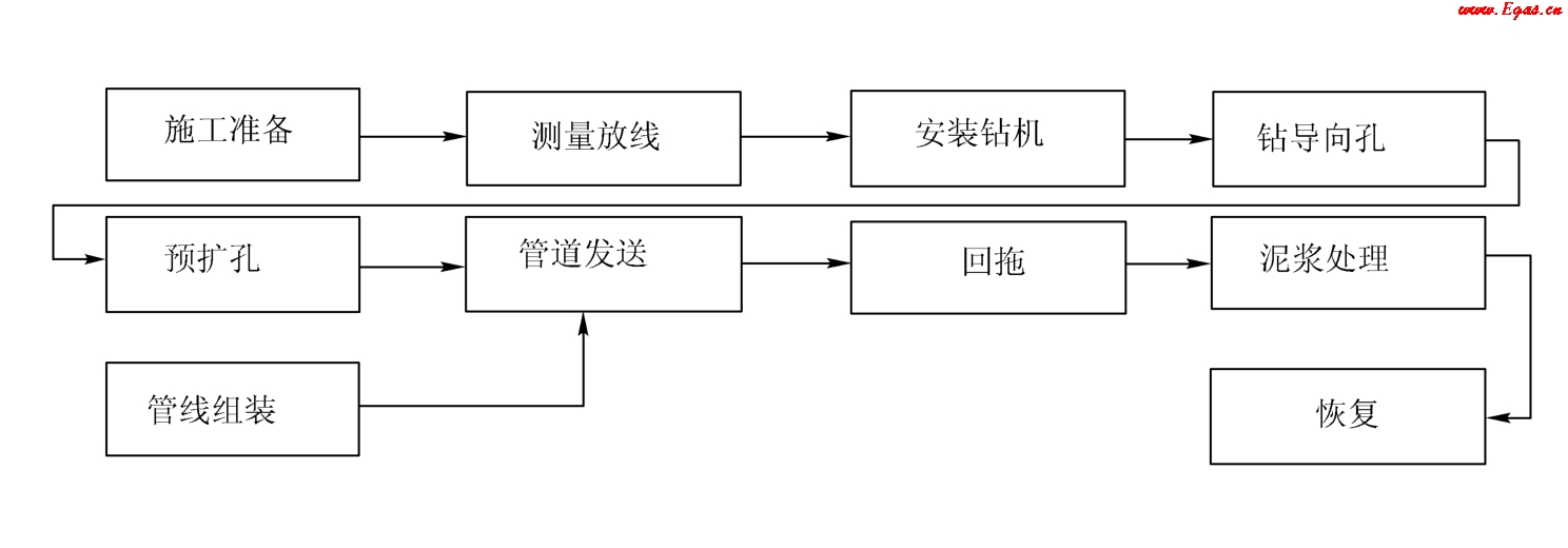 定向鉆法是一種經(jīng)濟(jì)實(shí)用,可以做到管道埋深達(dá)到安全可靠目的的敷管方法,宜作為管道穿越的第一優(yōu)選方法。定向鉆的優(yōu)點(diǎn)為:對(duì)地表的干擾較?。皇┕に俣瓤?;可控制鋪管方向,施工精度高。定向鉆的不足之處在于對(duì)施工場(chǎng)地要求較高,在礫石層中施工比較困難,一般不適用于成孔困難的地層。