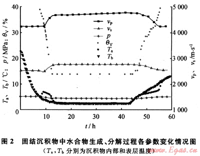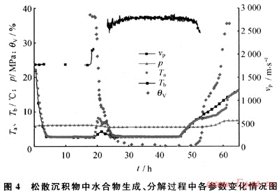 松散沉積物為采自于青島海邊的天然砂,粒徑為0.18~0.25mm,其物質(zhì)成分及含量如表2所示。由于難以探測(cè)松散沉積物的橫波速度,本文實(shí)驗(yàn)僅獲取了縱波速度隨水合物生成和分解的變化情況(圖4)。結(jié)果表明,水合物剛開(kāi)始生成時(shí),縱波速度有一個(gè)陡然增大的現(xiàn)象,隨后由于超聲衰減極大,縱波速度難以獲取[13]。水合物完成生成時(shí),含水合物松散沉積物的縱波速度為278m/s左右,比含飽和水沉積物的聲速增長(zhǎng)1000m/s左右。