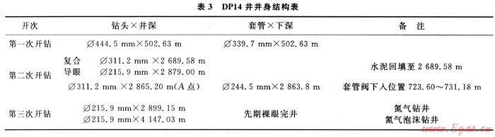 表3給出了DP14井井身結構。該井將Ø244.5mm技術套管下至A點,封隔住上部地層,以便于水平段欠平衡鉆進的順利實施。為了實現(xiàn)全過程欠平衡鉆完井,該井水平段采用先期裸眼完井。