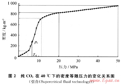 臨界流體是指溫度、壓力高于臨界溫度(Tc)和臨界壓力(pc)的流體。在臨界點(diǎn)附近,壓力的微小變化可導(dǎo)致密度的巨大變化[9]。如圖1、2。圖1中,C點(diǎn)為流體臨界點(diǎn),虛線(xiàn)所標(biāo)注的數(shù)值為流體密度。由圖1可以看出,在C點(diǎn)附近小的范圍內(nèi),流體的密度差異巨大,也即流體密度差異很大的數(shù)值線(xiàn)延伸并聚集在臨界點(diǎn)C附近。在此點(diǎn),較小的溫度或壓力發(fā)生變化,都會(huì)引起流體密度或體積的巨大變化。純二氧化碳的臨界溫度是31.06℃,臨界壓力是7.39MPa,如圖2描述了純二氧化碳在40℃下的密度隨壓力的變化關(guān)系。溫度40℃恒定的條件下,壓力從10MPa降到5MPa,在臨界壓力附近變化,密度數(shù)值從630kg/m3降到120kg/m3,變化劇烈;可見(jiàn)在臨界點(diǎn)附近,密度有很寬的變化范圍;溫度或壓力微調(diào)可使密度顯著變化。