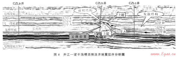 圖3是開(kāi)江-梁平海槽西側(cè)分別位于臺(tái)地、生物巖隆和海槽的3口井的連井圖,利用測(cè)井資料與地震資料將飛一段至飛三段劃分出4套地震層序,合成地震記錄中黃色區(qū)域?yàn)閮?chǔ)層段。層序A為高位早期,水體較深,儲(chǔ)層基本不發(fā)育。層序B-C為高位晚期,儲(chǔ)層開(kāi)始發(fā)育,CZLb井位于臺(tái)緣帶上,儲(chǔ)層段聲波曲線(xiàn)明顯降低,其儲(chǔ)層厚度較大,合成記錄上儲(chǔ)層底部地震反射明顯增強(qiáng);開(kāi)闊臺(tái)地內(nèi)CZLa井在層序B-C內(nèi)雖有一定的儲(chǔ)層發(fā)育,但厚度明顯變薄,合成記錄上儲(chǔ)層底部反射異常與臺(tái)緣帶反射相比異?,F(xiàn)象降低;位于深水海槽內(nèi)CZLc井在層序B-C內(nèi)無(wú)儲(chǔ)層發(fā)育。