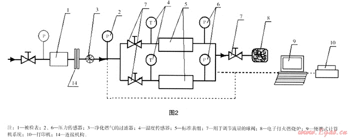 A. 總體思路:裝置采用標(biāo)準(zhǔn)表法對(duì)在線燃?xì)獗磉M(jìn)行檢定,其工作原理是:在線實(shí)流燃?xì)饨?jīng)過(guò)被檢表,根據(jù)實(shí)際流量大小流經(jīng)在線燃?xì)饬髁繕?biāo)準(zhǔn)裝置中的標(biāo)準(zhǔn)表,分別由標(biāo)準(zhǔn)表表前、表后的壓力傳感器測(cè)得被檢表表后及標(biāo)準(zhǔn)表前后的燃?xì)鈮毫Γ蓽囟葌鞲衅鳒y(cè)得管路中的燃?xì)鉁囟?,并將所測(cè)數(shù)據(jù)傳輸至計(jì)算機(jī),被檢表前壓力及被檢表數(shù)據(jù)也輸入至計(jì)算機(jī),數(shù)據(jù)處理后,自動(dòng)判斷被檢表是否合格。經(jīng)過(guò)標(biāo)準(zhǔn)表后的燃?xì)膺M(jìn)入燃燒爐后被燃燒處理,可避免污染大氣。為了能使該裝置適用于較大的測(cè)量范圍,標(biāo)準(zhǔn)裝置中可以并聯(lián)設(shè)置多塊不同量程的標(biāo)準(zhǔn)表,根據(jù)實(shí)流燃?xì)獾膶?shí)際流量大小,選擇流經(jīng)相應(yīng)的標(biāo)準(zhǔn)表。在每一臺(tái)標(biāo)準(zhǔn)表前的管路上均設(shè)有流量調(diào)節(jié)閥??筛鶕?jù)流量大小選用任意一臺(tái)標(biāo)準(zhǔn)表,或同時(shí)開(kāi)通并聯(lián)的兩臺(tái)或幾臺(tái)標(biāo)準(zhǔn)表,便于擴(kuò)大燃?xì)饬髁繖z測(cè)范圍。