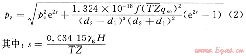 對于上部純氣體段的流動狀態(tài)可認(rèn)為是霧流,可以根據(jù)天然氣干氣井井底流壓的計算方法計算氣柱產(chǎn)生的壓力[5]。即
