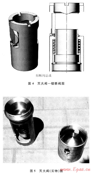滅火閥其實是一個特殊的鉆柱浮閥。氣體鉆井中,在鉆頭上部都安裝有安全裝置——浮閥(單向閥),可以防止環(huán)空中的壓縮空氣(或其他氣體)和攜帶的巖屑回流進鉆柱內(nèi)。這種閥裝有一個活瓣機構(gòu),循環(huán)停止時環(huán)空中的壓縮空氣和巖屑將會回流,回流推動活瓣關(guān)閉,反過來阻止回流。把浮閥經(jīng)過改進,在其上部設(shè)計一個低熔點合金制造的閥件(采用鋅環(huán)),加工形成了由單向閥總成和熔斷閥總成兩部分組成的滅火閥[4](見圖3、4、5)。在正常情況下,循環(huán)的空氣流動壓力使彈簧瓣向下張開,允許空氣循環(huán)通過。一旦環(huán)空著火,溫度上升,當超過設(shè)計溫度時,低熔點合金鋅環(huán)熔化使襯套封住空氣流道,關(guān)閉閥門,停止向井底循環(huán)補充空氣,從而切斷氣源使火熄滅[5]。