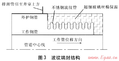 內(nèi)外管之間設(shè)波紋端封。為避免事故狀態(tài)下井室進(jìn)水導(dǎo)致保溫層進(jìn)水,需將內(nèi)外管之間封閉。但內(nèi)外管相對(duì)位移較大,封閉裝置采用不銹鋼波紋端封形式,波紋端封補(bǔ)償量按內(nèi)外管相對(duì)位移選取,經(jīng)計(jì)算波紋端封補(bǔ)償量為1050mm。這樣有效地解決了保溫層進(jìn)水及內(nèi)外管相對(duì)位移的問(wèn)題。波紋端封結(jié)構(gòu)見圖3。