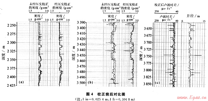 應(yīng)用上式,依據(jù)各井校正后的密度曲線求取了聲波時(shí)差,從圖4-c中可以看出,在井徑不變處,校正后得到的聲波時(shí)差與原始聲波時(shí)差吻合較好,而井徑變化導(dǎo)致聲波時(shí)差增大之處,也取得了較好的校正效果。