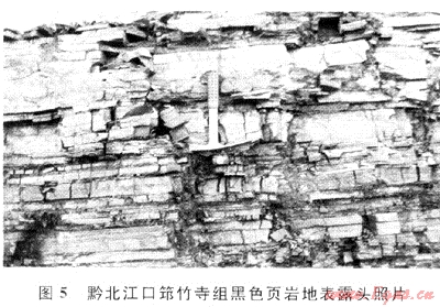 研究區(qū)下寒武統(tǒng)黑色頁(yè)巖主要發(fā)育于川南、黔北及黔東北-湘鄂西一帶,均以濱海沼澤及淺水缺氧停滯濱淺海沉積為主,與最大海泛面相對(duì)應(yīng)的低能黑色頁(yè)巖(包括碳質(zhì)頁(yè)巖和硅質(zhì)頁(yè)巖)相吻合,為克拉通基底盆地內(nèi)的第一套區(qū)域性烴源巖(屬于腐泥型有機(jī)質(zhì)類型,見表1),現(xiàn)今埋深在2000~4000m之間(圖4),總有機(jī)碳含量平均為2.74%[20]。其中,張家界實(shí)測(cè)總有機(jī)碳含量平均為7.7[21],Ro值平均為3.16%,處于高過(guò)成熟階段[22]。在野外實(shí)測(cè)剖面和井下巖心觀察中均發(fā)現(xiàn)了十分發(fā)育的裂縫(圖5),經(jīng)對(duì)研究區(qū)內(nèi)的老井進(jìn)行復(fù)查(威5、威18等井),已在該套頁(yè)巖中發(fā)現(xiàn)普遍存在的氣顯異常[23、24]。