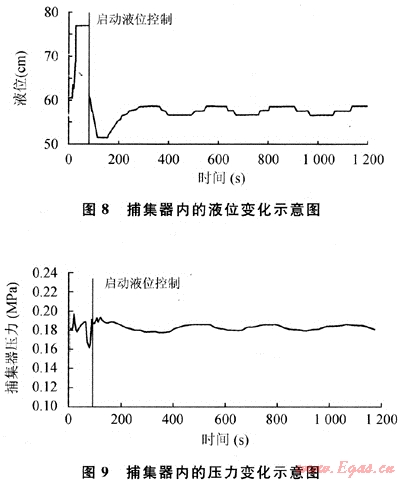 由圖6、7可知,在這一工況中,液位控制系統(tǒng)啟動(dòng)前,捕集器內(nèi)液位會(huì)慢慢降低,直至最低,在液位低于30cm時(shí),就會(huì)有大量氣體從捕集器液體出口溢出,導(dǎo)致捕集器內(nèi)壓力不穩(wěn)定。液位控制系統(tǒng)啟動(dòng)后,液位先增高然后逐漸達(dá)到穩(wěn)定工況,捕集器內(nèi)壓力也趨于平穩(wěn),沒有大幅度的上升或降低。