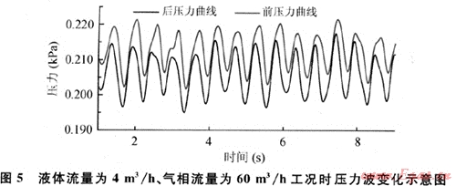 利用高速數(shù)據(jù)采集系統(tǒng)Lab-View,在實(shí)驗(yàn)環(huán)道上可完成段塞頻率和壓力波動(dòng)幅度測(cè)試,圖6為氣相流量為60m3/h、液相流量為4m3/h時(shí)由測(cè)壓點(diǎn)測(cè)得的壓力隨時(shí)間的變化圖(以該工況為例說(shuō)明管式液塞捕集器的工作性能)。從圖5看出,在8s內(nèi)出現(xiàn)了14個(gè)不同的段塞,并可確定段塞周期、頻率、段塞長(zhǎng)度以及段塞流動(dòng)時(shí)壓力變化情況。