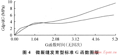 其特征主要表現(xiàn)為主裂縫閉合前G函數(shù)曲線有一定凸起,一般數(shù)值在4以下(圖4)。該類儲層閉合前由于受微裂縫濾失影響,造成裂縫濾失不恒定且濾失較大。