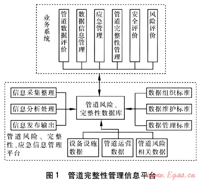 管道完整性管理信息平臺根據(jù)相關(guān)的數(shù)據(jù)組織、維護(hù)、管理標(biāo)準(zhǔn)建立管道風(fēng)險、完整性數(shù)據(jù)庫,同時具備信息的采集整理、分析處理和發(fā)布輸出功能。數(shù)據(jù)庫包括設(shè)備設(shè)施數(shù)據(jù)、管道運(yùn)營數(shù)據(jù)和管道風(fēng)險相關(guān)數(shù)據(jù)。管道業(yè)務(wù)系統(tǒng)包括管道數(shù)據(jù)評價、數(shù)據(jù)信息管理、應(yīng)急管理、管道完整性管理、安全評價、風(fēng)險評價等子系統(tǒng),通過GIS共享管道風(fēng)險、完整性數(shù)據(jù)庫,實現(xiàn)信息的共享、交互、集成。由于管道完整性管理系統(tǒng)是個較復(fù)雜的系統(tǒng),一方面必須從技術(shù)層面上進(jìn)行信息數(shù)據(jù)的分析、資源優(yōu)化分析處理、信息輸出來實現(xiàn)空間數(shù)據(jù)的共享、融合,另一方面須建立一套完整的風(fēng)險、完整性與應(yīng)急數(shù)據(jù)組織標(biāo)準(zhǔn)、數(shù)據(jù)維護(hù)標(biāo)準(zhǔn)、數(shù)據(jù)管理標(biāo)準(zhǔn)來保證系統(tǒng)平臺的正常運(yùn)行。只有經(jīng)過技術(shù)層面和體制層面的整合,在合理的范圍內(nèi)實現(xiàn)信息和資源的充分共享,才能使天然氣管道完整性管理系統(tǒng)達(dá)到最大的使用效益。