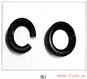 (2) 當(dāng)充泄氣體球閥開啟,在瞬間的小開度時介質(zhì)的流通間隙小,會使壓力瞬間增大,氣體或循環(huán)油首先直接沖擊在0型密封圈邊緣部位,由于0型密封圈的耐壓程度是有限的(一般不超過800Pa),就會瞬間將密封圈邊緣造成嚴(yán)重沖刷,從而影響閥門的密封性能和使用壽命。圖3為被沖擊破壞的0型密封圈。