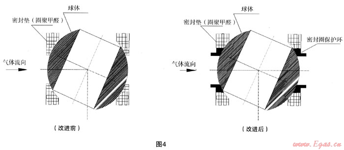 針對以上的原因及現(xiàn)象,結(jié)合液壓子站工作特點研究認(rèn)為:閥門內(nèi)漏原因和密封圈損壞現(xiàn)象提出,如果在氣動球閥內(nèi)加一保護(hù)密封圈裝置,避免密封圈直接與雜質(zhì)、高溫氣液、液壓沖擊接觸,此問題就可得到較好的解決。改進(jìn)前后詳見圖4。