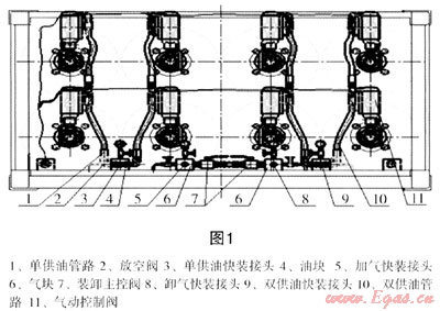 天然氣液壓子站加氣半掛車是將由8只大直徑氣瓶的管束橇安裝在1個可以舉升15°角的專用底盤上。前后倉內(nèi)各氣瓶端口均設(shè)有氣動控制閥、安全放散裝置及充卸氣管路等,如圖1。