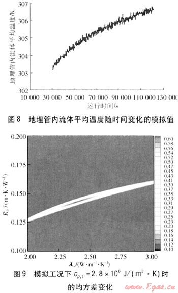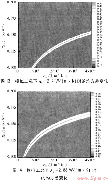 由圖2~4、9~11可知,均方差最小值的區(qū)域基本固定,其對(duì)應(yīng)的λs在2.4W/(m·K)左右。因此,可以得出結(jié)論,在實(shí)際過(guò)程中即使存在一些不確定因素的影響,得到的模擬值與理論值存在一定的偏差,但是經(jīng)過(guò)參數(shù)估計(jì)處理得到cp,s的變化對(duì)結(jié)果的影響也很小,cp,s偏差±12.5%對(duì)λs的影響在±2%左右。通常情況下cp,s的獲得可以依據(jù)現(xiàn)場(chǎng)鉆孔中心巖土分析來(lái)確定,相對(duì)誤差一般在±5%以?xún)?nèi),對(duì)λs的影響更小。