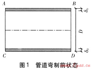 天然氣高壓管道進行彎制時,管道彎曲段受力變形,彎制前狀態(tài)見圖1,彎制后狀態(tài)見圖2,彎曲段Ⅰ′-Ⅰ′斷面見圖3。管道在彎制過程中,內(nèi)側(cè)管壁受壓力,由于擠壓作用管壁由直線形(如CD段)變成圓弧形(如C′D′段),管壁由于壓縮變短而增厚;外側(cè)管壁受拉力,由于拉伸作用管壁由直線形(如AB段)變成圓弧形(如A′B′段),管壁由于拉伸變長而減薄。管壁減薄會使強度降低,為保證管壁減薄后仍有足夠強度,要求管壁有一定厚度,在彎曲段管壁減薄應均勻。