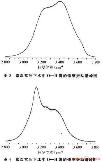 圖3和圖4分別是液態(tài)水和冰的拉曼譜圖。2800~3000cm-1為O—H鍵的伸縮振動譜峰,是水的特征譜帶。該區(qū)域內寬而高的饅頭峰實際上是由4個峰疊加而成的,它們是3241cm-1處的帶氫鍵的O—H鍵的對稱伸縮振動峰,3415cm-1處帶氫鍵的0—H鍵的反對稱伸縮振動峰,3540cm-1處不帶氫鍵的O—H鍵對稱伸縮振動峰以及3617cm-1處不帶氫鍵的O—H反對稱伸縮振動峰[8~11]。各個峰位代表了分子轉動或振動的頻率,揭示了原子間距和作用力的信息。2800~3000cm-1區(qū)域內各個峰所占的比例,反映了水中氫鍵斷裂的數目。從圖3可以看出,液態(tài)水中原子間距較大,形成的氫鍵較少,所以3241cm-1和3415cm-1處峰所占比例較小。而圖4所示的冰的拉曼譜圖中,3540cm-1和3617cm-1,處的拉曼峰幾乎消失,這主要是因為冰中水分子通過氫鍵構成了四面體結構,原子間距較小,氫鍵數目較多,因而3241cm-1和3415cm-1處峰所占比例較大。