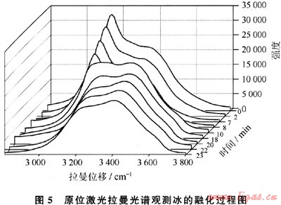 圖5是原位激光拉曼光譜測定冰融化過程的譜圖,從該譜圖中可以看到,隨著系統(tǒng)溫度的不斷升高,冰的四面體結構逐漸瓦解,氫鍵數目逐漸減少,峰包的高波數側不斷上揚,而低波數端不斷消亡,從該譜圖上看冰的融化過程幾乎是水結冰的逆過程。