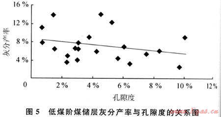 霍林河地區(qū)煤熱演化程度低,還沒有達到大量生烴階段,煤層氣組分以生物氣為主,含少量煤熱解氣(圖4)。從煤巖煤質(zhì)上看,霍林河地區(qū)煤層鏡質(zhì)組含量高,對煤層氣成藏有利。金振奎等通過沁水盆地分析了灰分產(chǎn)率對煤儲層性能的影響,認為無機物一般充填于煤孔隙及裂隙[10],占據(jù)孔裂隙空間。并根據(jù)之間的關(guān)系統(tǒng)計,得出灰分產(chǎn)率與孔隙度之間呈線性負相關(guān)。本次研究用低煤階樣品也得出同樣的關(guān)系(圖5):即灰分產(chǎn)率越高,孔隙度越低。低煤階煤層氣氣運移通道主要以孔隙型為主。因此對于低煤階煤儲層,灰分含量對煤儲層滲透性有較大影響,灰分越大,煤儲層滲透性越差。