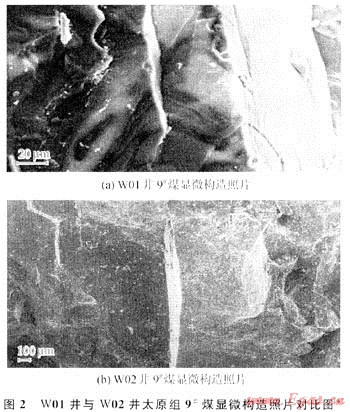 通過WO1井和W02井煤樣品的顯微構造照片對比,可清楚地觀察到兩口鉆孔巖心顯微構造的明顯差異。WO1井所處的構造位置是應力場低值分布區(qū),煤巖割理裂隙十分發(fā)育。圖2-a顯示出在大約100μm長度范圍內分布有條微裂隙,裂縫明顯地具有張剪性力學特性;而W02井由于處應力場高值分布區(qū),煤巖裂縫分布密度低且為閉合(圖2-b)。