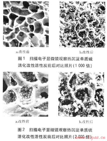對活性炭吸附能力起支配作用的是微孔的比例,經(jīng)過熱沉淀單質(zhì)硫活化改性后的活性炭比表面積增加,在表面以及內(nèi)部沉積硫顆粒,對汞的吸附能力大為增強,而且硫與汞化學(xué)結(jié)合后能防止汞的再逸出。掃描電子顯微鏡觀察熱沉淀單質(zhì)硫活化改性活性炭前后對比照片(1000、2000倍)見圖1、2。由圖1可知,改性后的活性炭微孔比例顯著增加,由此活性炭的比表面積也增大,從而吸附能力也大幅增強。由圖2(與圖1為同一區(qū)域)可知,在改性后的活性炭微孔結(jié)構(gòu)中,大量沉積的硫與活性炭化合,形成親單質(zhì)汞的化合物,由此極大地提高活性炭對單質(zhì)汞的脫除能力。由Nucon公司生產(chǎn)的經(jīng)過熱沉淀單質(zhì)硫活化改性的活性炭的脫汞效率可提高70%以上。經(jīng)過碘化改性的活性炭,在同樣條件下,吸附脫汞能力是未經(jīng)改性活性炭的160倍[18],可以極大地減少活性炭用量。