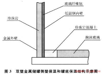 罐頂現(xiàn)多采用外罐拱頂加內(nèi)罐鋁吊頂結(jié)構(gòu)(圖2),其絕熱結(jié)構(gòu)與施工相對簡單。儲罐側(cè)壁保冷結(jié)構(gòu)如圖3所示。20世紀(jì)80年代以前,大多為單一的松散珍珠巖,其缺點是設(shè)備降溫后,內(nèi)壁收縮使得罐側(cè)壁的上部及頂?shù)倪吘墔^(qū)域缺少珍珠巖,所需二次填充量很大,填充時間也較長,致使內(nèi)外罐間進入大量的空氣,并使得許多水分在兩罐之間的空氣內(nèi)冷凝下來,加劇了設(shè)備的腐蝕。另外,珍珠巖受潮,導(dǎo)熱系數(shù)將變大,使操作期間冷藏液的蒸發(fā)量增加,加大了制冷機的負(fù)荷,增加了操作成本。20世紀(jì)80年代后期建設(shè)的雙層低溫罐多數(shù)都在內(nèi)罐的外壁增加一層彈性保溫氈,這層氈在松散珍珠巖側(cè)壓力的作用下被壓縮,當(dāng)內(nèi)罐降溫時,彈性氈回彈,以此來補償罐的收縮量,大大減少了二次填充量,即避免了二次填充。填充物——彈性氈是由玻璃棉制成的,其回彈量等于罐的收縮量,可以很容易計算出來。對于罐底絕熱保溫結(jié)構(gòu)設(shè)計,不但要保證儲罐的冷損失率降至最小,而且保溫材料還要具有足夠的抗壓強度來支撐儲罐和介質(zhì)重量。根據(jù)罐底受力情況和最大限度降低冷損失率,建議將底部絕熱保溫結(jié)構(gòu)分成周邊圈梁和中心圓形隔熱區(qū)兩部分,參見圖3[15]。