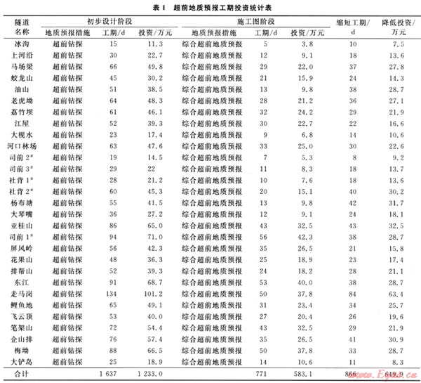 在保證工程安全的情況下,對(duì)比初步設(shè)計(jì)和施工圖設(shè)計(jì),西氣東輸二線(xiàn)隧道工程初步設(shè)計(jì)階段采用單一的超前鉆探進(jìn)行地質(zhì)預(yù)報(bào),初步設(shè)計(jì)階段實(shí)施超前地質(zhì)預(yù)報(bào)措施的工期及投資見(jiàn)表1;西氣東輸二線(xiàn)隧道工程施工圖設(shè)計(jì)階段采用綜合超前地質(zhì)預(yù)報(bào),施工圖設(shè)計(jì)階段實(shí)施綜合超前地質(zhì)預(yù)報(bào)措施的工期及投資見(jiàn)表1[9~12]。