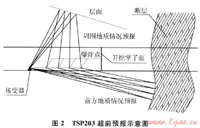 TSP203是目前公認(rèn)為預(yù)報(bào)效果較好的儀器,其原理是利用地震波在不均勻地層的界面產(chǎn)生反射波的特征和信號(hào)接收的時(shí)間等參數(shù)來(lái)判斷前方的地質(zhì)變化。TSP屬于長(zhǎng)距離超前地質(zhì)預(yù)報(bào),其有效深距可達(dá)150~300m,預(yù)測(cè)距離在100m左右是比較準(zhǔn)確的。在不良地質(zhì)體定位上,最大分辨率不小于1m;位置判別精度約為90%,其規(guī)模判別精度可達(dá)85%;TSP203型儀器可辨識(shí)出斷層、有無(wú)地下水、多水、少水、弱富水帶和強(qiáng)富水帶等,而對(duì)突涌水量和水壓的定量預(yù)測(cè),仍需結(jié)合其他探水手段進(jìn)行[5];探測(cè)成果準(zhǔn)確度取決于準(zhǔn)確的操作與圖像解釋技術(shù)。